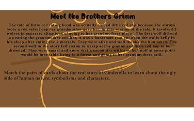 The project requirements were to create a matching game with 2 decks of cards with 10 pairs to match on any theme of our choosing. My theme is my favourite dark tales from the Brothers Grimm fairy tales.